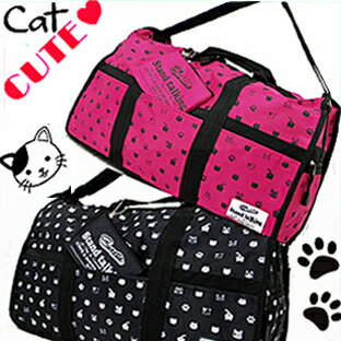 A655【CATs★ネコ総柄 トラベルボストンバッグ&ポーチ付き】キャット大容量肩掛けショルダー付き猫柄角型ボストン2WAYロールボストンバッグ修学旅行ボストンバッグ林間学校臨海学校小学生中学生高校生女子ネコ耳猫耳ねこハグロゴ柄ロールボストンバッグお財布ポーチ付